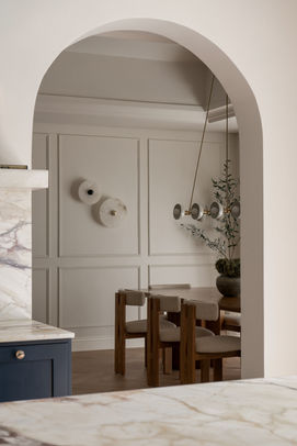 In the kitchen, the decision to move away from an all-white scheme was deliberate. “The space felt too large and bright,” she notes. Deep navy cabinetry grounds the room, drawing directly from the tones of the Breccia Capraia marble used on the countertops and backsplash.