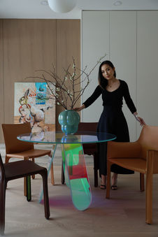 In both the living and dining areas, artworks by Pepe Hidalgo serve as visual anchors. “We used the art as a grounding element,” explains Wang. “Its earthy tones blend effortlessly into the palette, while subtle accents of blue, green, and red introduce quiet energy—echoed again in the accessories and soft furnishings.”