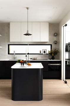 To maintain spatial openness, Atelier Fēn used a sleek glass partition between the main kitchen and wok kitchen—providing necessary separation without compromising light or flow. The kitchen itself is defined by a restrained black-and-white palette, softened by natural light that filters through strategic openings. Integrated appliances maintain the visual purity of the space.