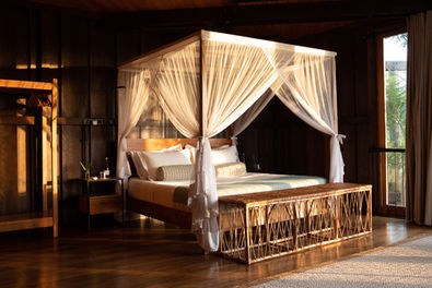The house follows a crescent-shaped plan, lifted lightly on stilts and sheltered by corrugated metal roofs supported by slender timber posts. Designed with Sri Lanka’s hot, humid climate in mind, Trebartha operates as a low-energy structure that relies on passive comfort. Its timber structure provides natural insulation, ensuring thermal ease without excess.