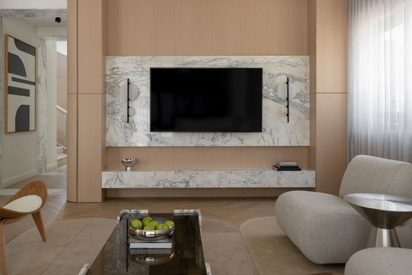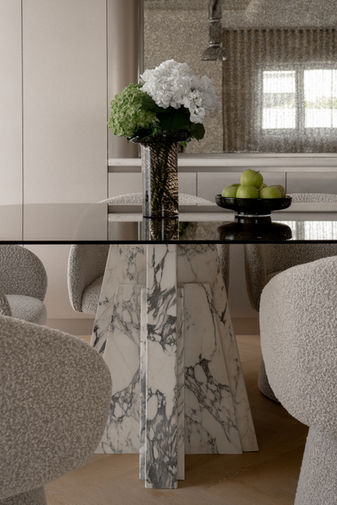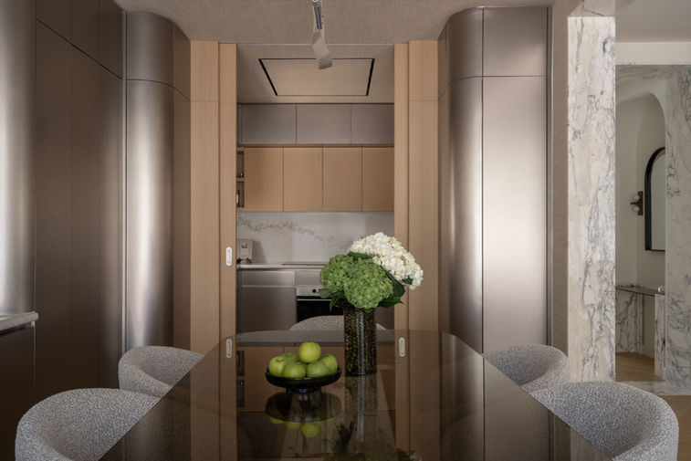 The palette is anchored in off-white tones and oak, with subtle contrast introduced through brushed stainless steel, Calacatta Vagli marble and warm-tinted glass. Colour is used sparingly and with intent, appearing as soft accents that animate the space without overwhelming it.