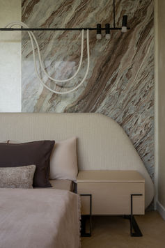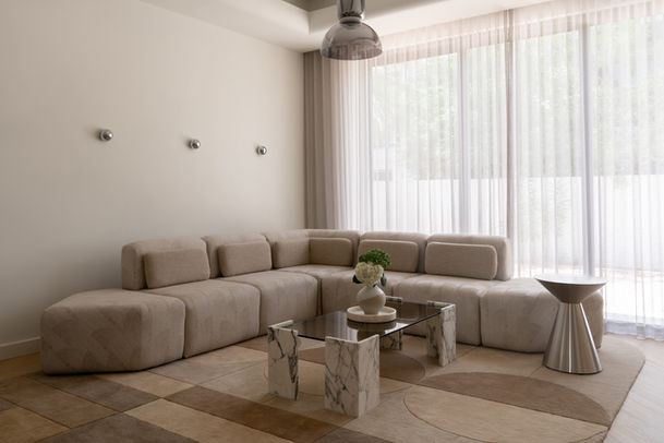 Furniture and objects throughout the home are largely designed or curated by the studio’s in-house brand, DOT Objects. Sculptural marble and glass tables, a modular sofa system and a bespoke handwoven rug establish a cohesive visual language.