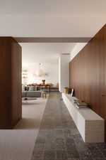 We worked with an open-plan layout for the living and dining areas, while subtly defining zones through a low, custom-designed furniture piece. This allows for openness without losing a sense of separation. The apartment has a natural flow, yet certain spaces can be closed off using refined metal and glass partitions. These details were directly inspired by the Art Deco context—a period in which metal craftsmanship plays a prominent role. This language was extended into other custom elements throughout the apartment, creating a cohesive dialogue between past and present.