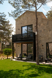 Villalardaki en önemli unsur yerel taşlar ve el işçiliği. Dış cephede kullanılan Urla kireç taşı, sadece 3-4 kilometre öteden çıkarılmış. Böylece hem karbon ayak izi azaltılmış hem de yapılar coğrafyanın doğal bir uzantısına dönüşmüş.