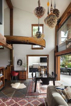 - Dining area: Arne Jacobsen Series 7 chairs for Fritz Hansen, Blu Dot table, vintage Herman Miller Shell red chair.