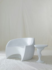 At the heart of PURE lies a curated collection of sculptural works crafted from RALPH PUCCI's proprietary Plasterglass material. This unique medium, resembling plaster yet known for its durability, captures the artists' original touch. The exhibition features an all-white palette—tables, lighting, and seating—each piece handcrafted with clean lines and textured nuances, inviting contemplation on form and material.