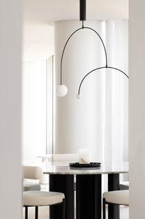 The furniture and lighting in the apartment are from 1stdibs, Studio Oliver Gustav, Michael Anastassiades, Ralph Pucci, Avenue Road, Art + Loom, Living Divani, Cassina, Piero Lissoni, Boconcept, Sawkille, Minotti, Hive, Luminaire, Pierre Yovanovitch, Patricia Urquiola, EWE Studio, The Future Perfect, DWR, Luca Nichetto, Kvadrat, Gubi, Holly Hunt, Ligne Roset and Paola Lenti.