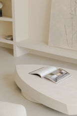 The kitchen is intentionally minimal: no upper cabinets, a wide workspace, and a travertine countertop that continues the material narrative. The bathroom follows the same logic—an open walk-in shower, a two-pedestal travertine basin, and hidden storage integrated into matte plaster niches. Despite low ceilings and a tight plan, the apartment feels open, calm and almost weightless.